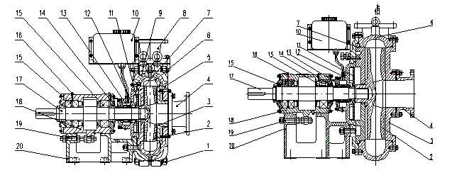 1. 泵蓋螺栓     2. 葉輪     3. 前護(hù)板     4. 進(jìn)口錐管     5. 泵蓋     6. 護(hù)套      7. 后護(hù)板      8. 出口錐管      9. 泵體     10. 水箱   11. 副葉輪    12. 減壓蓋    13. 密封部    14. 拆卸環(huán)     15. 軸承  16. 注油嘴    17. 軸     18. 軸承體     19. 調(diào)整螺栓     20. 托架